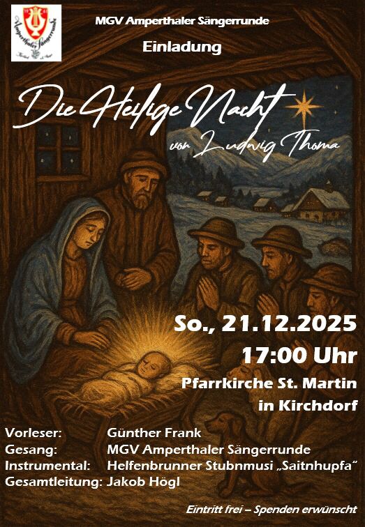 Veranstaltungen Kalender 25.10.2025 Jubiläumsfeier beim MGV Aresing anlässlich 60 Jahre MGV Aresing. 15.11.2025 18 Uhr 29.11.2025 19.30 Uhr Patrozinium in St.Brictius, Aiterbach Adventsfeier der Amperthaler Sängerrunde beim Oberwirt Kirchdorf 30.11.2025 Seniorennachmittag der Gemeinde beim Burgerwirt 11.12.2025 Adventsgottesdienst weiterlesen...